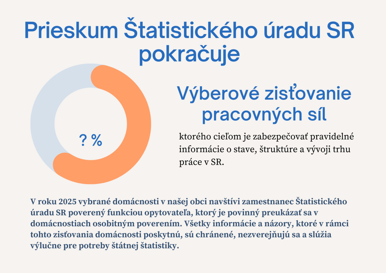 V roku 2025 vybrané domácnosti v našej obci navštívi zamestnanec Štatistického úradu SR poverený funkciou opytovateľa, ktorý je povinný preukázať sa v domácnostiach osobitným poverením. Všetky informácie a názory, ktoré v rámci tohto zisťovania domácnosti poskytnú, sú chránené, nezverejňujú sa a slúžia výlučne pre potreby štátnej štatistiky.