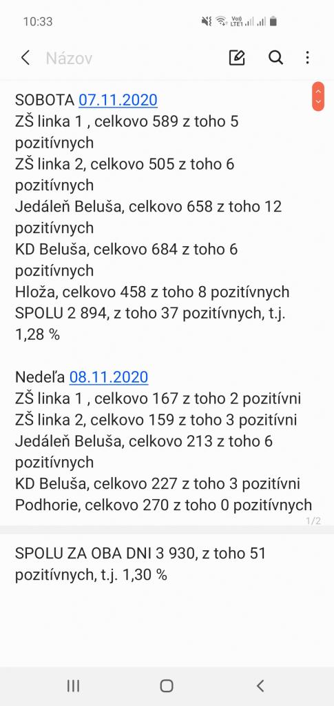 Výsledky 2.kola celoplošného testovania počas víkendu 07.11.2020 a 08.11.2020 v obci Beluša- počet pozitívnych prípadov nám klesol takmer o 1%. Zaujímavosťou je, že v tomto kole sa testovania v našej obci zúčastnilo iba o 1 občana menej, ako v prvom kole.